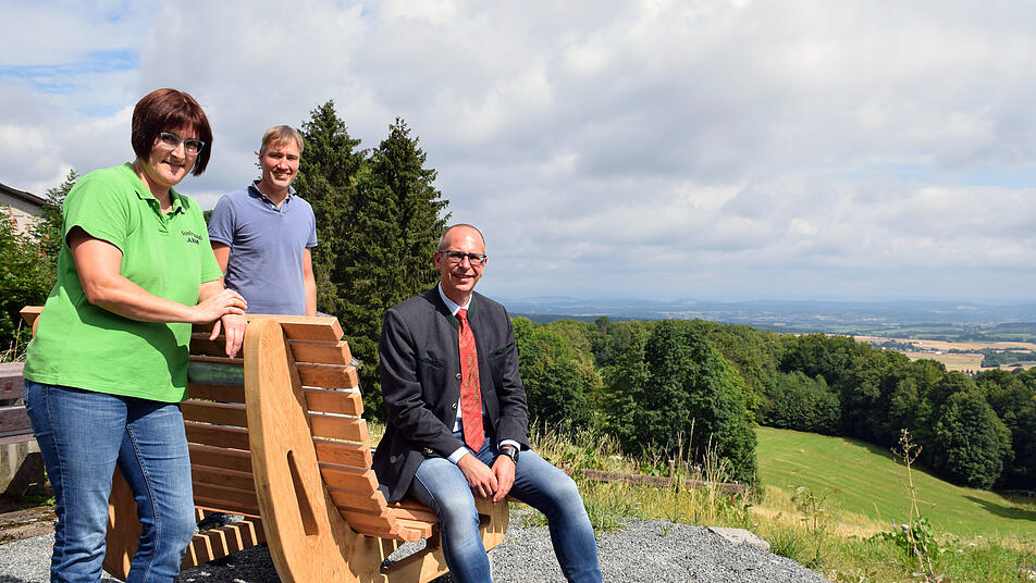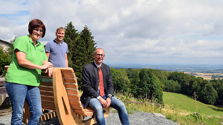 „Daheim ist es auch ganz schön“: Unter diesem Motto werden derzeit neue Landschaftsbänke im Landkreis Lichtenfels aufgestellt. Eine davon steht in Lahm (Lichtenfels) am Skilift mit herrlicher Aussicht in den Franken- und Thüringer Wald. Landrat Christian Meißner traf sich dort mit der Vorsitzenden des Gartenbauvereins, Angelika Schütz, und Kreisfachberater Michael Stromer zum „Probe-Sitzen“. Die Landschaftsbänke sind nämlich eine Gemeinschaftsaktion der Gartenbauvereine und des Landkreises. Das teilt das Landratsamt Lichtenfels mit.