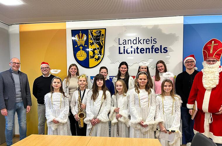 "Himmlischen Besuch" durfte Landrat Christian Meißner am Freitagmittag im kleinen Sitzungssaal des Landratsamtes empfangen. Wie das Landratsamt Lichtenfels mitteilt, statteten ihm Schüler des Meranier-Gymnasiums Lichtenfels als Engelchen und Weihnachtsmann verkleidet einen Besuch ab und "beschenkten" ihn mit einem kleinen Standkonzert mit bekannten weihnachtlichen Liedern.