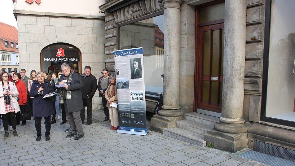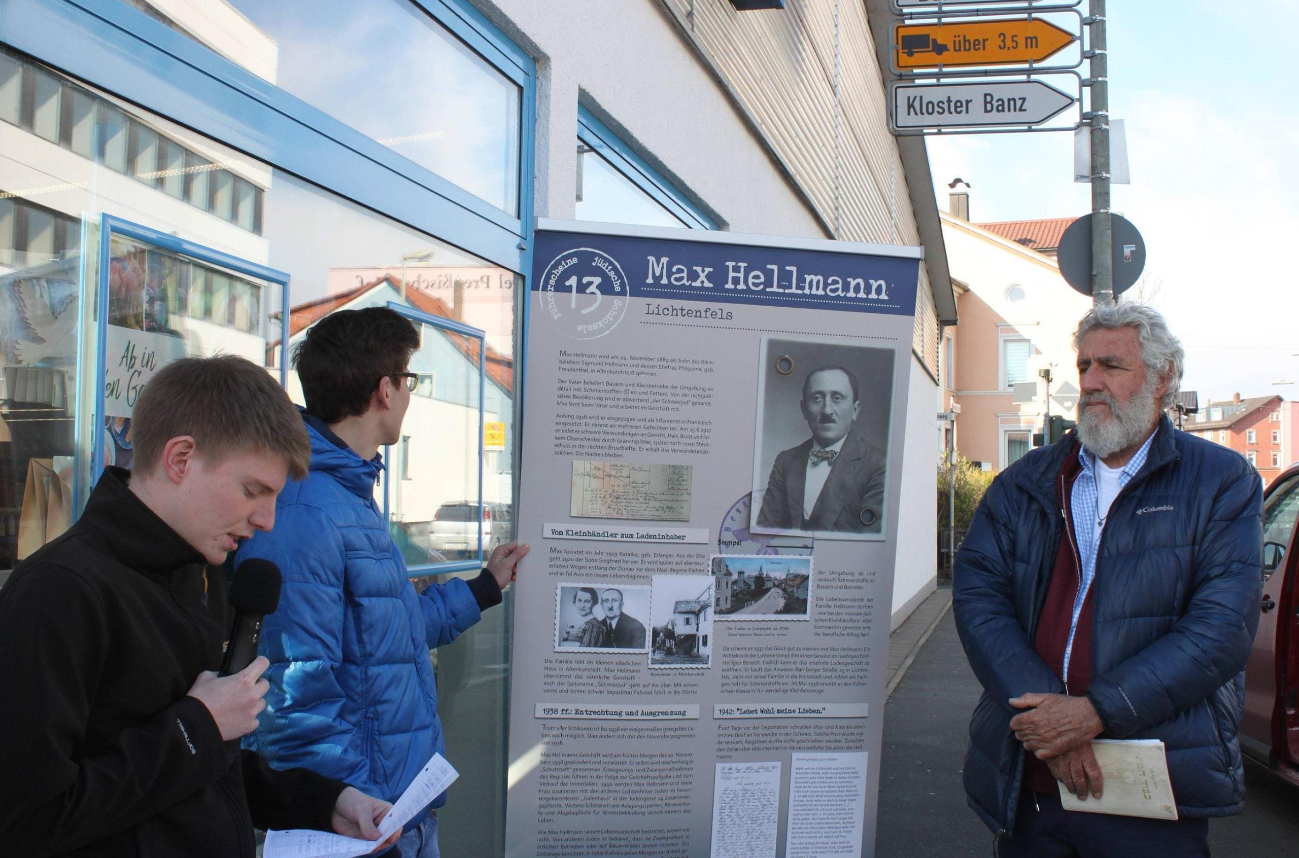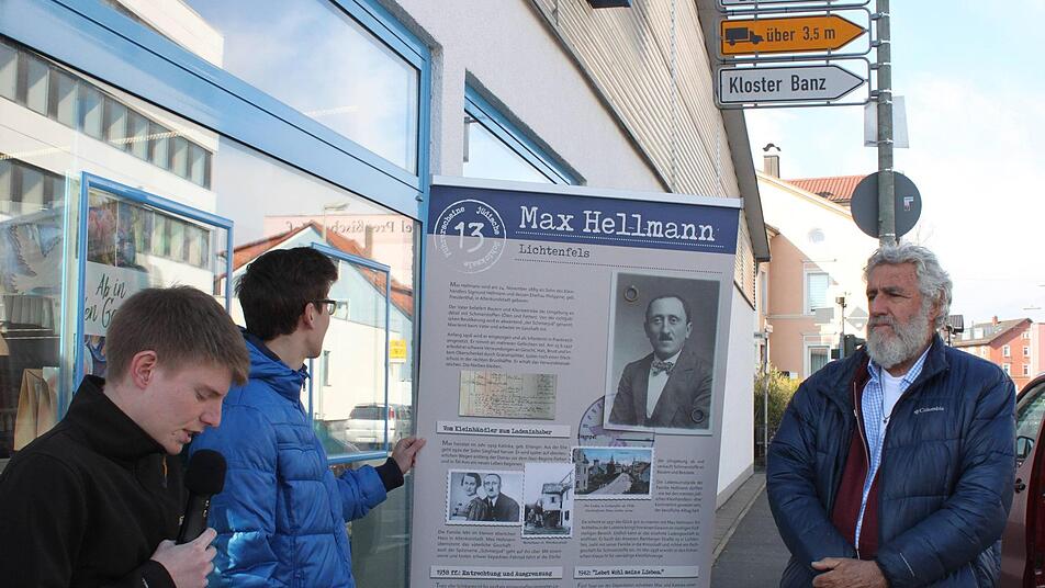 Bevor man gemeinsam zu der Stelle kommt, wo Max und Kathinka Hellmann wohnten, berichten Schüler des Gymnasiums gemeinsam mit ihrem Lehrer Manfred Brösamle-Lambrecht von dem, was sie in einem Geschichtsseminar über die jeweiligen Familien herausgefunden haben. Diese Forschungsarbeit geht weiter, wie Stadtarchivarin Christine Wittenbauer aufzeigt.