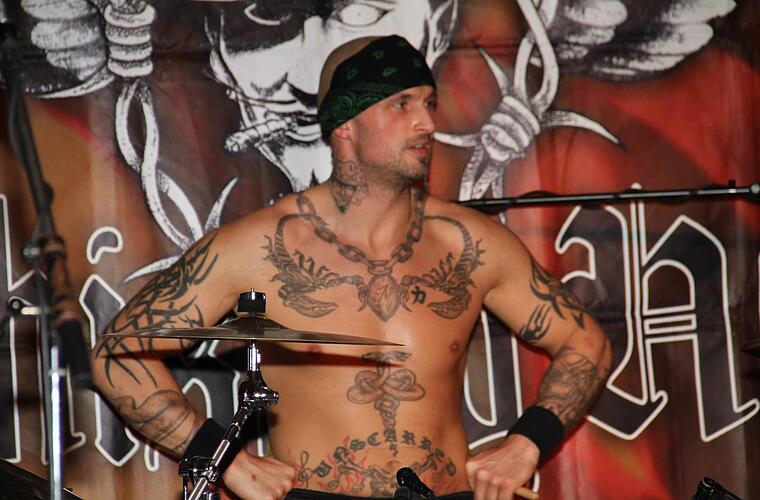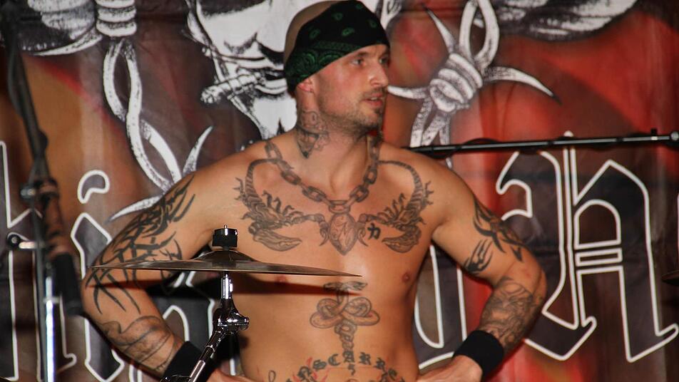 Dabei sind die drei Jungs mitnichten Neulinge im Metier. Namensgeber Oliver Wallenberg war Sänger und Gitarrist bei Doc Eisenhauer. Seine Mitstreiter, Drummer Bubi Blacksmith und Bassist Carsten Meyer sind ebenfalls in der Szene bekannt. Das die drei in Lichtenfels zu hören waren, ist Erhard Schlottermüller von den Sankt-Georgs-Pfadfindern zu verdanken. Man hatte ihm Whiskey Hell wärmstens empfohlen. Eine gute Empfehlung, wie sich im Laufe des Abends herausstellen sollte. Die Band macht auch optisch etwas her, was nicht allein an den beiden Aufstellern mit den fast nackten Frauen liegt. Auch von Drummer Bubi Blacksmith ist viel Haut zu sehen und bemerkenswerte Tattoos. Das dürfte besonders das weibliche Publikum erfreut haben. Zwar lässt sich Whiskey Hell etwas Zeit mit dem Beginn ihres Konzerts, dann aber geht es mehr als zwei Stunden zur Sache. Ohne Pause und ohne Unterbrechung.