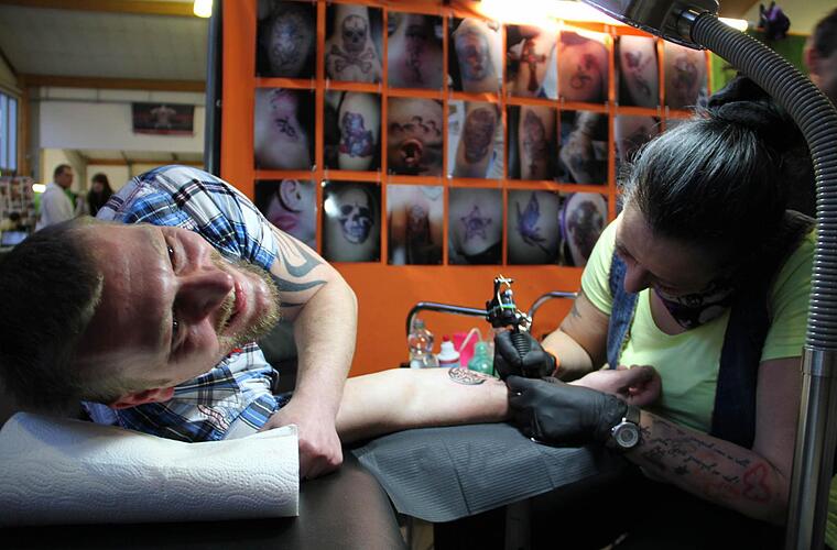 Schmerzverzerrte Gesichter sind nicht zu sehen. Wer sich für ein Tattoo entschieden hat, lässt die Prozedur mit Gelassenheit über sich ergehen. Es halten auch Jungs von der Statur eines Schrankes still, wenn sie von zarter Frauenhand "gequält" werden. "Das Tattoo bereitet dem Kunden mehr Schmerzen als mir", schmunzelt eine 35-Jährige aus dem österreichischen Villach.