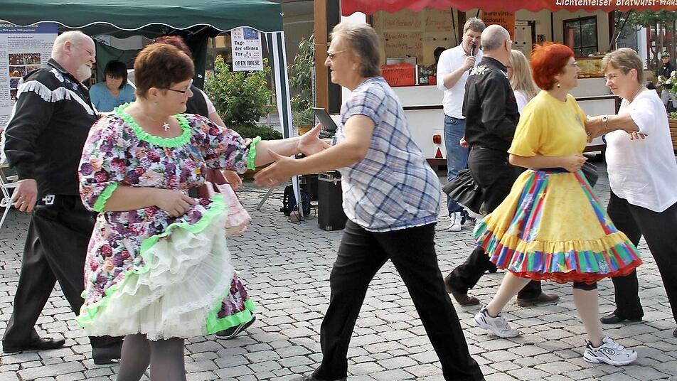 Zufällig vorbeikommende Passanten bleiben stehen, als die Main-River-Dancers ihren großen Auftritt haben. Für eine knappe halbe Stunde prägen Westernkleidung und schwingende Petticoats das Bild auf dem Marktplatz.