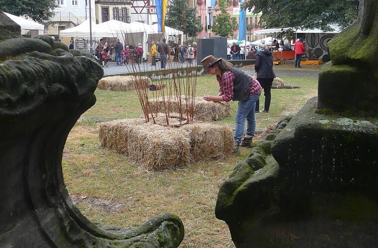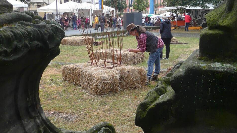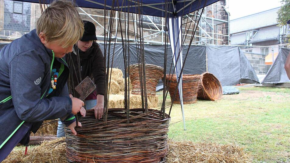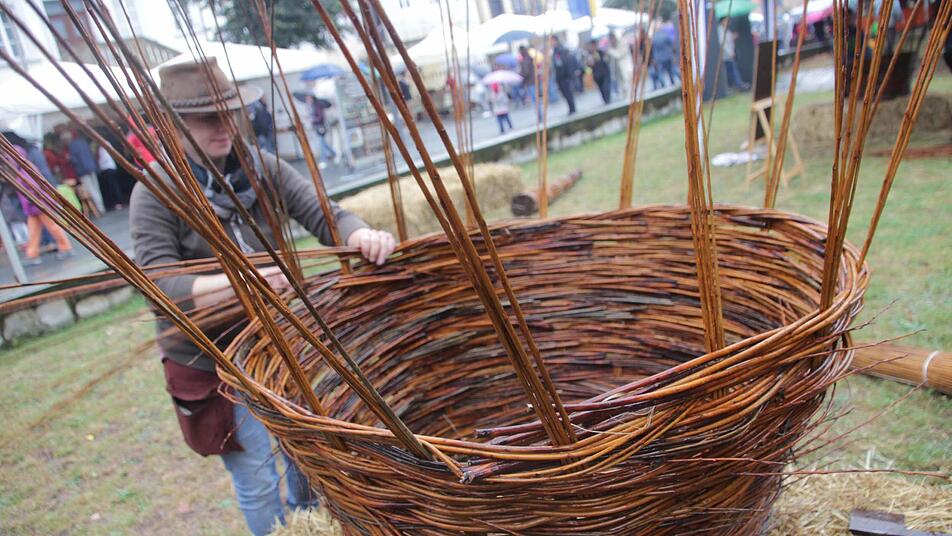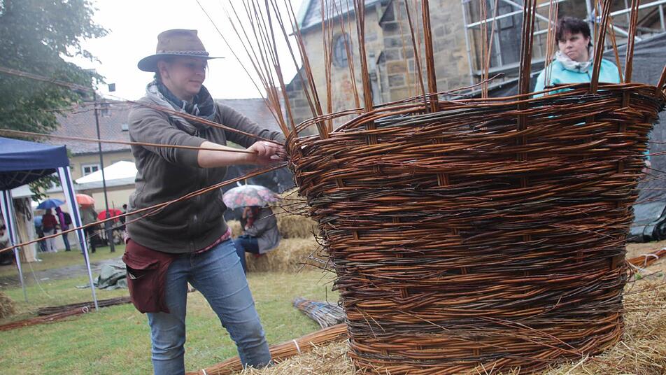 Schade - das war wohl das am häufigsten gehörte Wort während dieses Korbmarktes. Schade, dass den Beteiligten und Besuchern nicht besseres Wetter beschert war. Nina-Regina Nötzelmann, Initiatorin der Mitmach-Aktion vor der Stadtpfarrkirche, ging mit gutem Beispiel voran, dass man sich die Freude davon nicht vermiesen lassen sollte: Die bayerische Landesinnungsmeisterin des Flechthandwerks sorgte dafür, dass dennoch etliche Leute, auch Kinder, Lust bekamen, an dem geplanten Flecht-Turm mitzubauen. Einige nahmen es in Kauf, richtig nass zu werden. Unterstützung gab es auch vom Organisations-Team des Korbmarktes. Unterm Strich sind aber zu wenige Elemente entstanden, um durch Ineinanderstapeln eine stattliche Höhe zu erreichen. Es sei klar gewesen, dass diese Aktion im Freien wetterabhängig ist, sagte Nötzelmann.