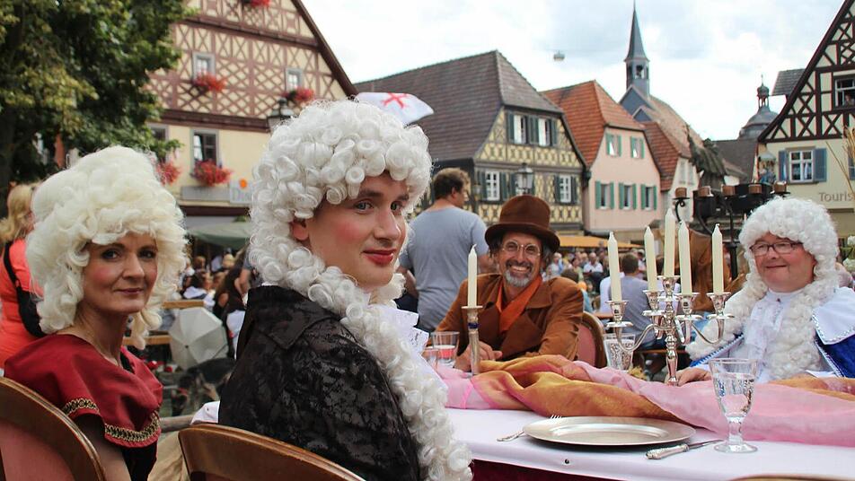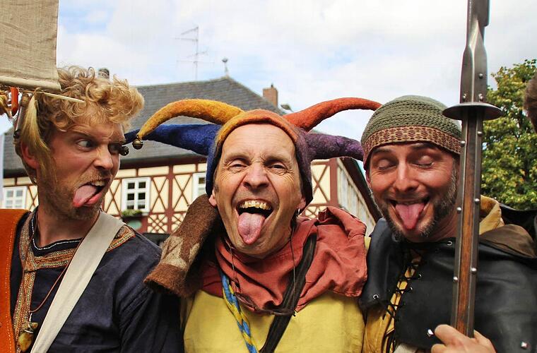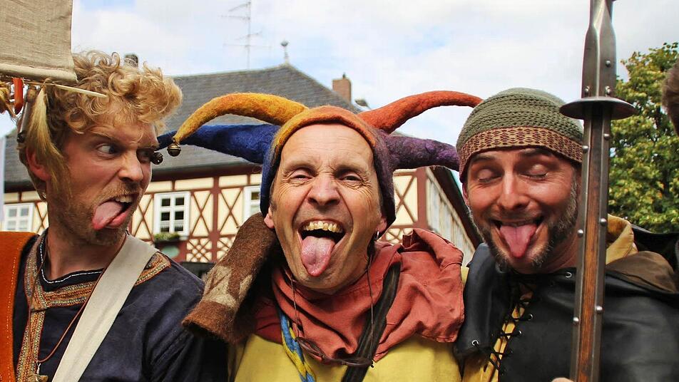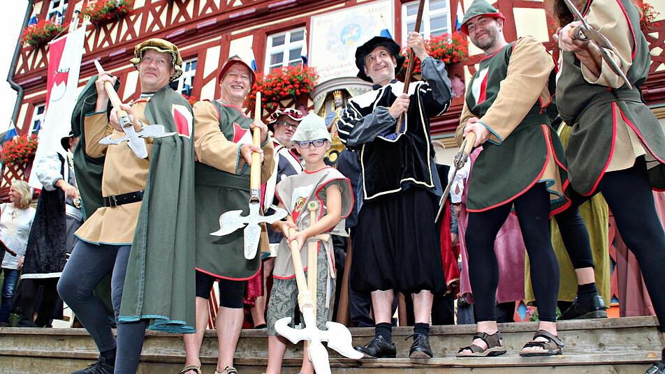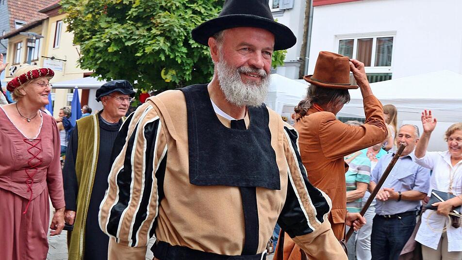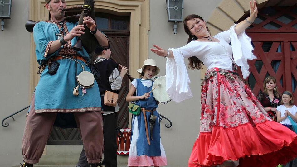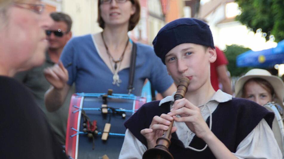 Zwischendurch trieb "Zauberer Rebasius Funkenflug" mit Feuerfunken, Stelzenbeinen und ganz viel Witz den Kindern vor Lachen Tränen in die Augen. Einzug der Kaufleute und Ratsmitglieder und der Umzug aller Gewandeten Festteilnehmer wurden mit Pauken und Trompeten von der Blaskapelle Uetzing-Serkendorf und dem Spielmannszug Höchstadt an der Aisch umrahmt.