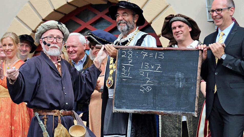 Ebenso neu war das "Adam-Riese-Quiz", das federführend Florian Hacker entwickelt hat. Eine moderne Schnitzeljagd aus Stadthistorik, Rechengeschick und Expedition. Der Preis war verlockend, wie seinerzeit ein Säckchen Silberlinge: Zweimal 500 Euro und zweimal 250 Euro bar auf die Hand. Rechenmeister Professor Reich wärmte das Mathematikwissen der Kleinen und Großen im Publikum mit seinen traditionellen Fingerakrobatik auf. Dann konnte die Zeitreise losgehen.