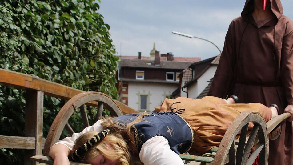 "Leut', schafft Eura Dood'n her!", rief der dunkle Mann mit der Schnabelmaske, Uwe Böh, in der Drosselgasse und sammelte die von der Pest Dahingerafften ein. Man begegnete Adam Riese und Viktor von Scheffel. "Wir sind hier in einer mehrdimensionalen Zeitreise unterwegs. Mein Freund Viktor von Scheffel lebte immerhin über 300 Jahre später als ich", lachte Ulrich Schmitt alias Adam Riese.
