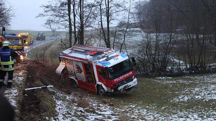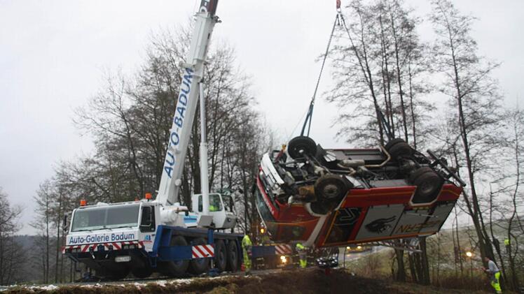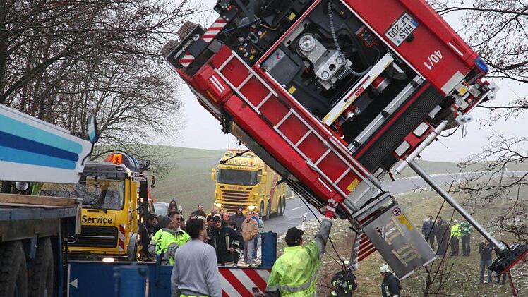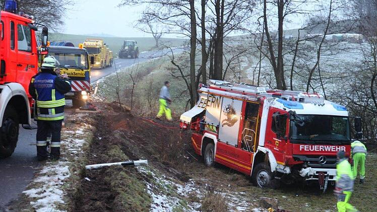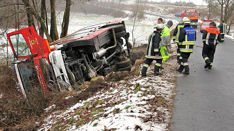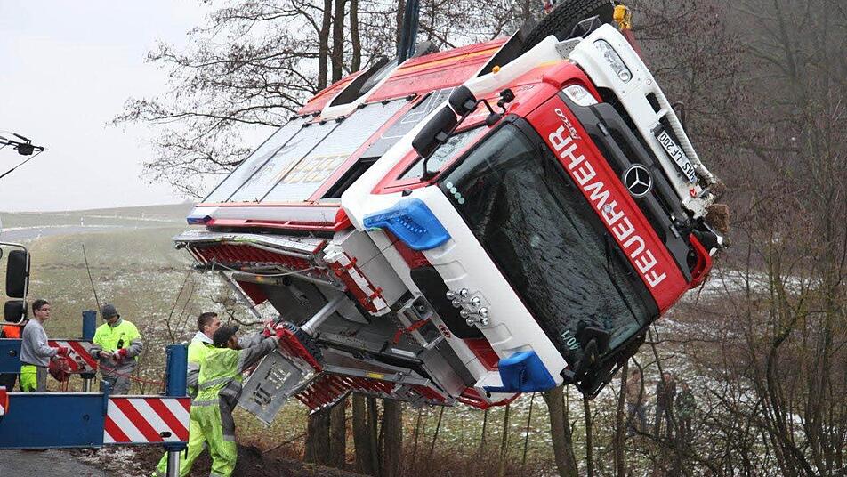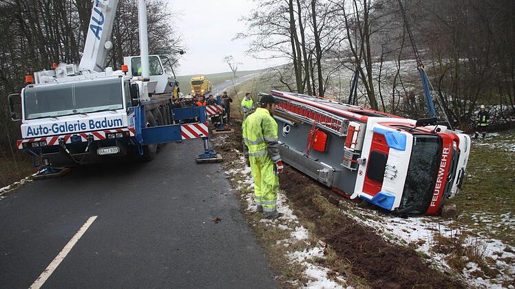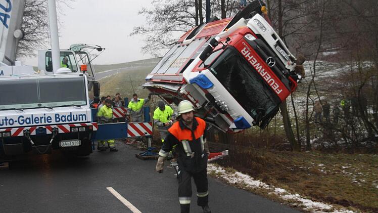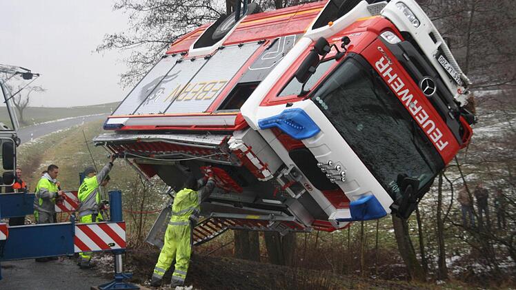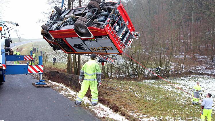 Bergung aus eigener Kraft war nicht möglich Die Kollegen aus Ebern und den kleineren Stadtteilwehren, die zur Hilfeleistung und Verkehrsregelung herbeigeeilt waren, schauten deprimiert drein, da eine Bergung aus eigener Kraft nicht möglich war. In dem Feuerwehrfahrzeug befanden sich noch gut 2000 Liter Wasser.