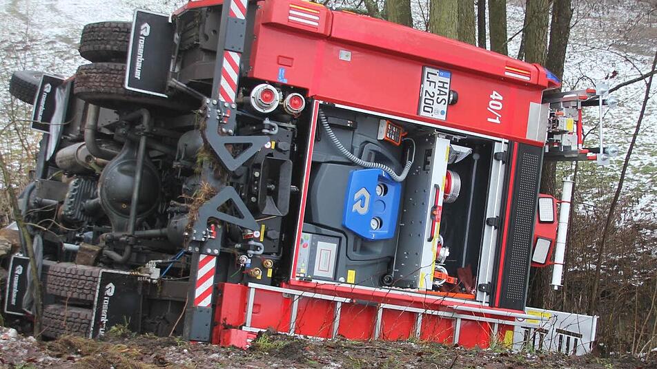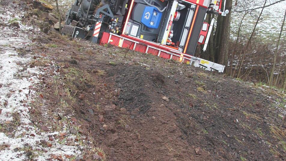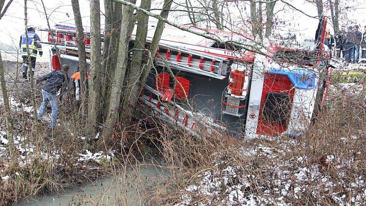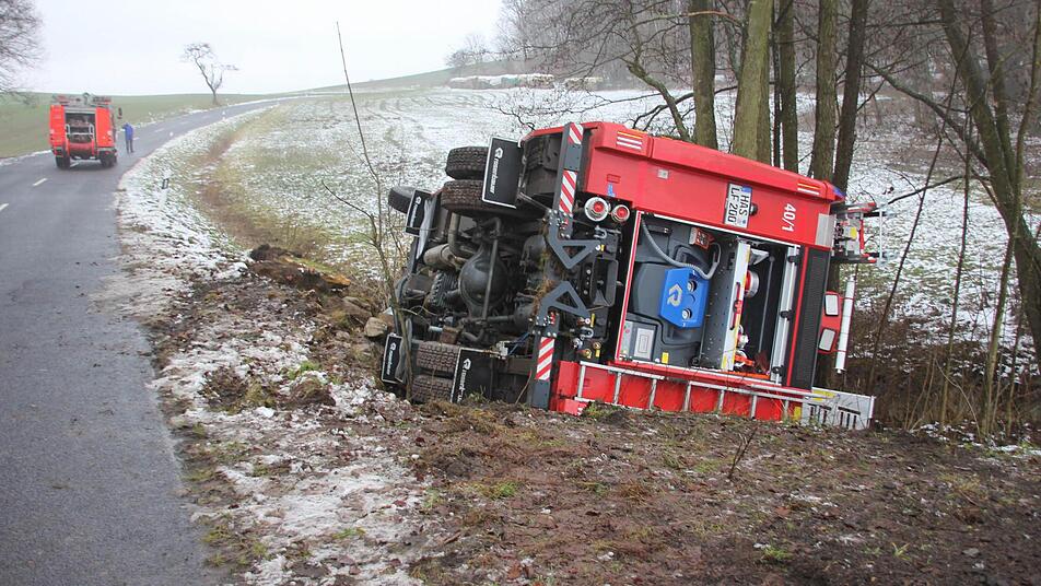 Dort blieb das Fahrzeug über dem Bach auf der rechten Fahrzeugseite an einer Baumgruppe hängen. Die vier Insassen, alle Eberner Feuerwehrleute, blieben unverletzt und befreiten sich selbst aus der misslichen Lage. Am Steuer hatte ein 25-jähriger, erfahrener Feuerwehrmann gesessen.