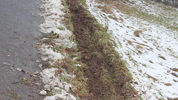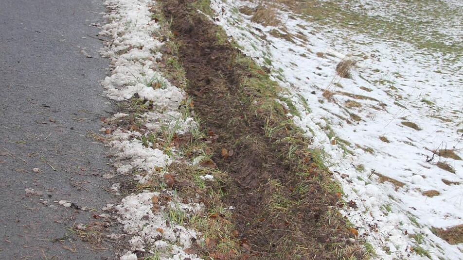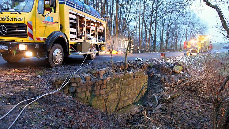 Dort pflügten die rechten Reifen auf einer Strecke von rund 80 Metern den Straßenrand um, ehe das das nagelneue Löschgruppenfahrzeug gegen die Sandstein-Brüstung der Brücke über die Preppach krachte und dann - fast schon stehend - nach rechts umkippte.