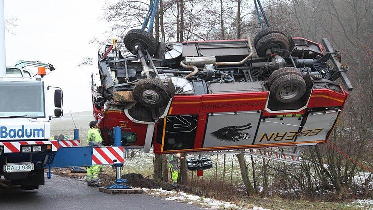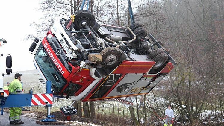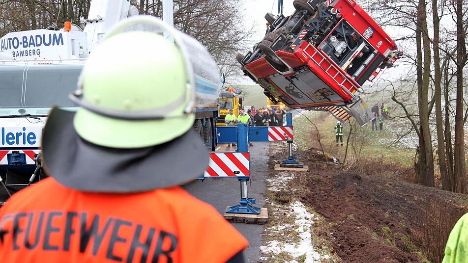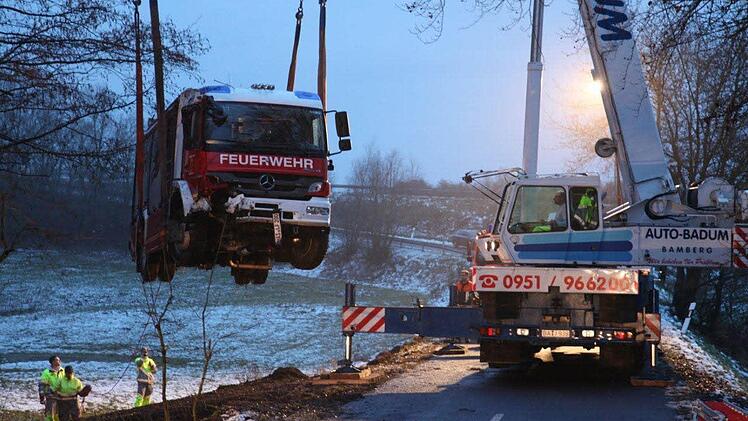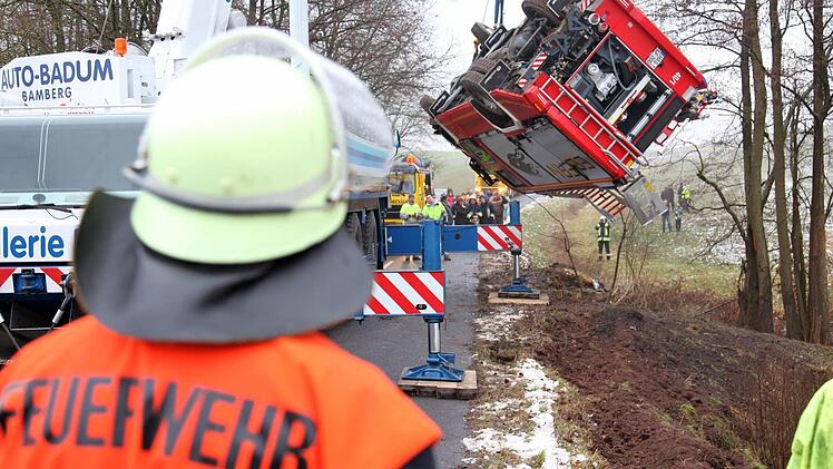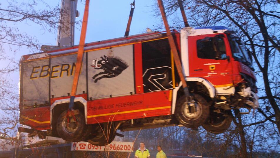 Mithilfe des Autokrans wurde das Löschfahrzeug aus dem Graben gehoben, auf die Räder gestellt und nach Ebern in den Stadtbauhof geschleppt. Dort wird es so lange bleiben, bis feststeht, was damit passiert. Nach der Bergung zeigten sich Feuerwehrleute und Vertreter des Eberner Stadtrates zuversichtlich, dass eine Reparatur möglich ist.