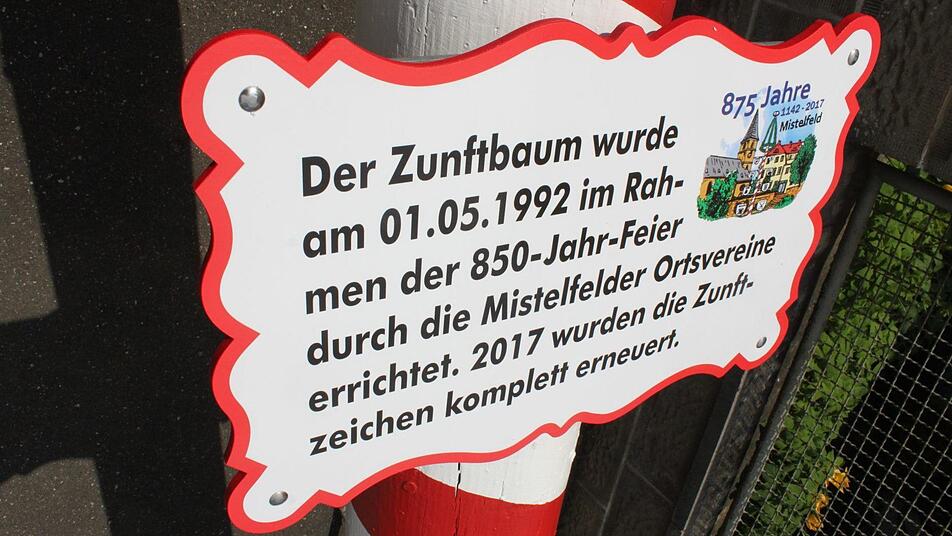 Da machten die Mistelfelder Vereine einmal mehr gemeinsame Sache. Sie ließen nicht nur die Farbe am Stamm auffrischen, sondern alle Zunftschilder neu fertigen. Anhand des Zunftbuches, mit Unterstützung der Kreishandwerkerschaft, wurden einige Zunftzeichen überarbeitet, wie Martin Dirauf (Zweiter Vors. Gesang- und Musikverein) berichtet.