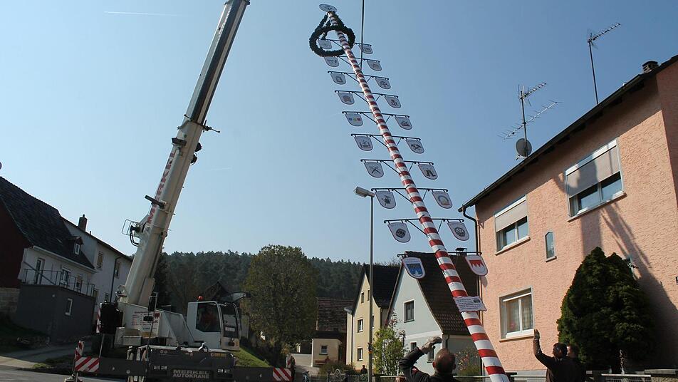 Gestern, rechtzeitig also vor dem Leuchsentaler Heimatfest nächste Woche, wurde der Zunftbaum mittels Kran und Hubsteiger wieder aufgestellt. Bernd Krauß, Ortsvorsitzender der CSU, die heuer den Vorsitz der Gemeinschaft der Ortsvereine inne hat, dankte allen Beteiligten, auch den beiden Familien, die Baum und Schilder über den Winter gelagert hatten. Seitens der Stadt Lichtenfels wurde zur rund 3000 Euro teuren Sanierung ein Zuschuss von 20 Prozent in Aussicht gestellt.