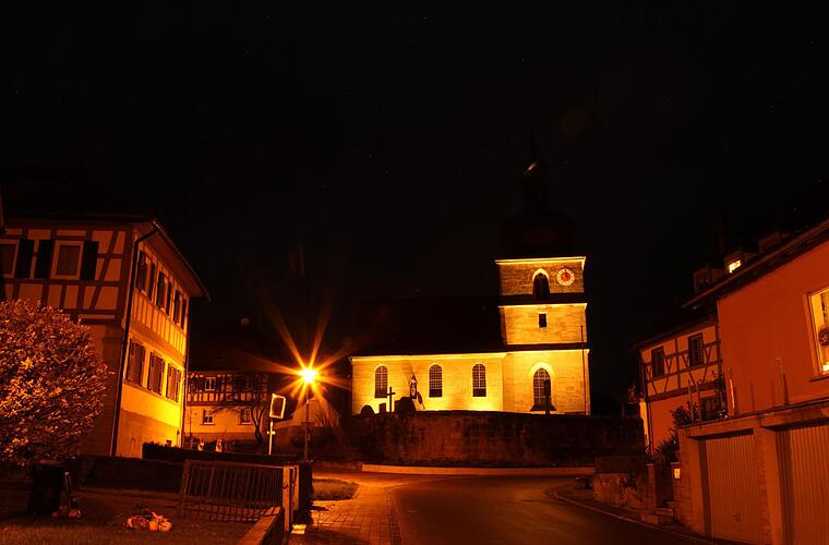 Oberleiterbach, sondern auch der ganze Stolz der Einwohner. Deshalb ließen die Lätterbocher das genau 500 Jahre alte Gotteshaus im Jubiläumsjahr aufwändig innen renovieren und schlossen jüngst die Arbeiten an der Neugestaltung des Außenbereichs ab. Das "i-Tüpfelchen" ist seit wenigen Tagen zu sehen: Der trutzige Sakralbau ist nun nachts beleuchtet.