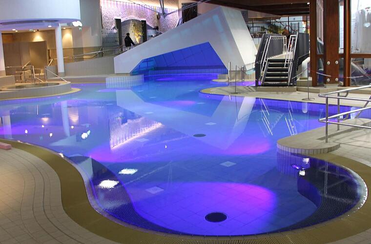 An das neu gestaltete Erlebnisbecken sind zwei Whirlpools angeschlossen, die ebenfalls eine zeitgemäße Optik bekamen. Die neue Grotte ist mit einem innovativen Licht- und Ton-Konzept versehen - ein Fest für Auge und Ohr. Wechselnde Farben und sanfte Klänge sorgen fürs Wohlbefinden der Gäste und zwei Massagefunktionen für Waden und Füße spenden Fußreflexzonenmassage. Auf der großzügig bemessenen Ruhegalerie im Obergeschoss stehen Liegen zum Entspannen bereit.