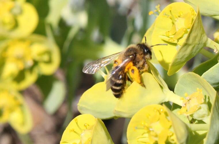 An den Fluglöchern der beiden Bienenkästen tut sich kaum etwas. Gewissheit darüber, wie die zwei Völker den Winter überstanden haben, werden die nächsten Wochen geben. Die Frühblüher im Schulgarten sind erste Nahrungsquellen für verschiedene Pollen- und Nektarsammler. In der Mittagssonne brummt es schon an den Beeten, obwohl es recht kalt ist. Einige Mädchen und Jungen aus der dritten Klasse machen sich an zwei Insektenhotels zu schaffen - das ältere wird mit Naturmaterialien wie Stroh, Rindenstücken und kurzen Bambusröhren befüllt, das neue für längere Haltbarkeit mit Wachs eingepinselt. Eine Hummel wird lautstark und freudig zur Kenntnis genommen. Die Kinder der "Bienen- und Garten"-AG unter der Leitung von Rektorin Ursula Schüßler treffen sich an ihrem freien Nachmittag, um dafür zu sorgen, dass sich Insekten auch künftig hier wohlfühlen und ein reiches Nahrungsangebot finden. Mit Unterstützung einiger Väter wird gewerkelt und geharkt.
