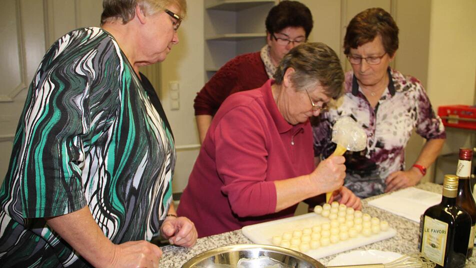 Alexander Leikeim ist der einzige Mann in der Frauenrunde. Der 75-Jährige Lichtenfelser bäckt gerne und möchte sein Repertoire um Pralinen ergänzen. "Daheim hab ich es schon einmal probiert", sagt der Hobbybäcker. Jetzt möchte er lernen wie es richtig geht. Seine Gruppe hat sich für die Herstellung von Portweinpflaumen entschieden. Dabei handelt es sich um in Portwein eingelegte Pflaumen, die eine Hülle von Marzipan und weißer Kuvertüre erhalten. Beim Verkneten des Marzipans mit Puderzucker ist Alexander Leikeim offenbar in seinem Element. "Na freilich macht es Spaß", sagt er und lacht.