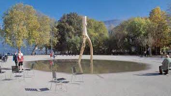 Der Brunnen mit der Fischreuse ist als flache Wassermulde angedacht.