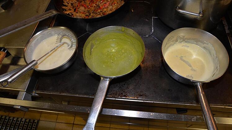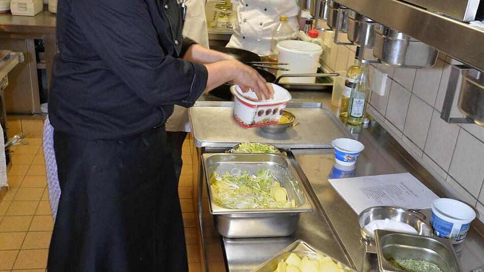 Während Rico Pfitzner brät, schneidet, schwenkt und rührt, hat er ein höchst aufmerksames Publikum: genüsslich ziehen die Topfgucker das Aroma dieser Soße ein, kosten jenes Gericht und kommentieren mit freudig gewölbten Augenbrauen den Geschmack von Fleischküchla und Dressing.