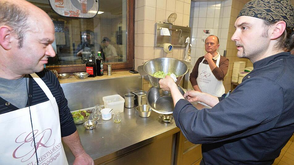 Normalerweise geht man ins Restaurant, um etwas zu essen. An diesem Abend sind die Leute jedoch gekommen, weil sie kochen wollen. Besser: Weil sie lernen möchten, noch ein bisschen besser zu werden am heimischen Herd. In der Küche des Hotel-Restaurants Rödiger ist alles vorbereitet für einen längeren Abend. Der Männer-Kochkurs kann beginnen.