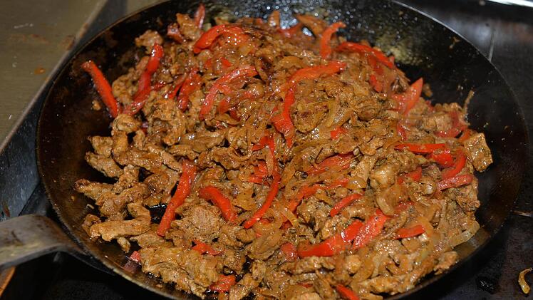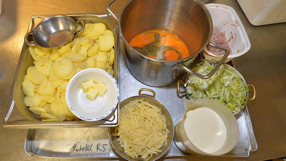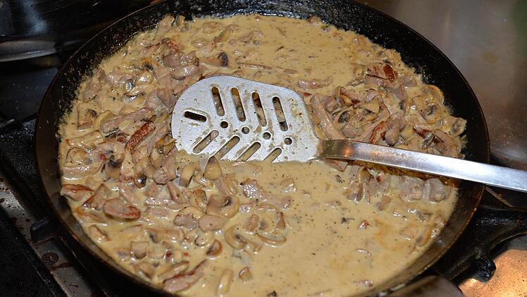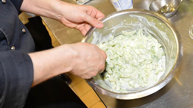 Nun geht's an die Hauptspeisen: Geschnetzeltes "Zürcher Art" und "Gyros Art", Zaziki, Gulasch, Hackfleischküchla, Kartoffelauflauf mit Schinken und Lauch, Gurkensalat, Balsamicodressing sowie Sahnedressing stehen auf der Agenda der Speisen, die an diesem Abend entstehen sollen.
