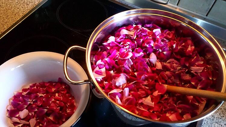 Das Rezept: 500 g Rosenblütenblätter von Duftrosen mit 1 Liter Wasser in einen Kochtopf geben und den Sud 30 Min. leicht köcheln lassen. Wenn die Blütenblätter weich sind, kurz den Pürierstab einsetzen; Saft von 1 - 2 Zitronen hinzufügen und mit 1 kg Gelierzucker vier Minuten sprudelnd kochen, dann in heiß ausgespülte Gläser füllen und verschließen.