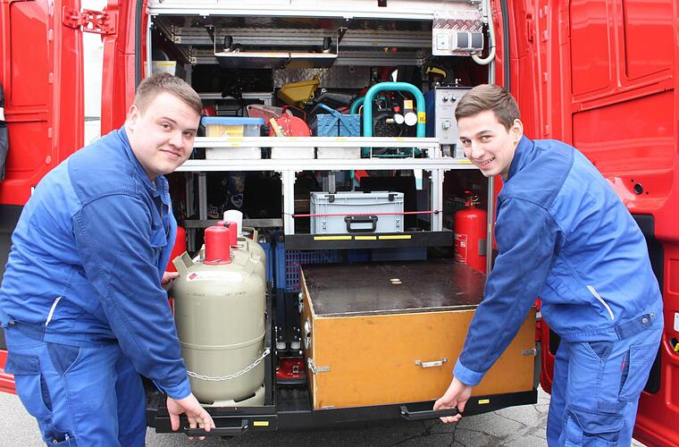 Junge Leute aus der Lehrwerkstatt der Maschinenfabrik Fischer haben das neue Brandschutzerziehungs-Fahrzeug mit einem durchdachten Einbau versehen.