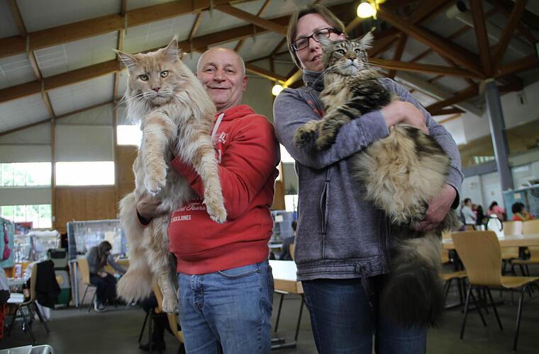 Ein Prachtexemplar von einem Maine-Coon-Kater erregt das Interesse von Frank Löffler und seiner siebenjährigen Tochter Laura. Der Lichtenfelser interessiert sich für die Rasse, die als "sanfte Riesen" bezeichnet werden. Sie gelten als anhänglich, klug, sozial und verspielt. "Die sehen super aus", sagt Frank Löffler. Das Prachtexemplar trägt den bezeichnenden Namen Heinrich der Große.