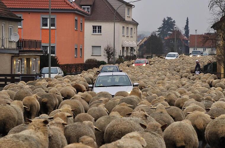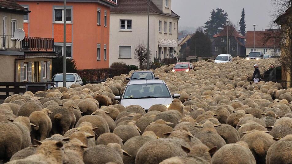 Am Samstag ging auf der Michelauer Bahnhofstraße von 13.20 bis 13.30 Uhr gar nichts mehr. Ein riesige Schafherde legte den kompletten Verkehr lahm. Erst als die Herde kurz vor der Abzweigung nach Schwürbitz auf eine Wiese abbog, normalisierte sich die Situation wieder.