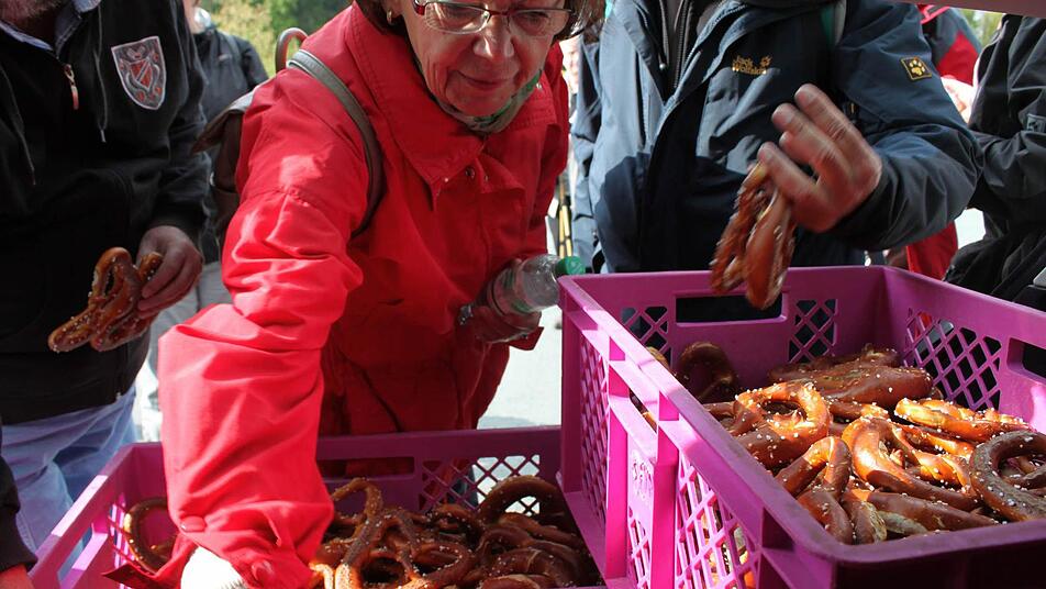 Als dann kurz vor dem Start gegen 10 Uhr auch noch ein Versorgungsauto eintraf, durfte sich jeder Wanderer kostenfrei mit Wasser und Brezeln für die kilometerlange Tour eindecken.