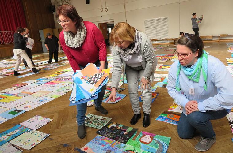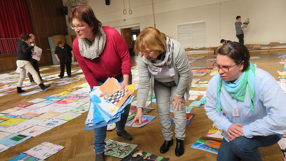 Der stellvertretende Kreisverbandsvorsitzende, Bankdirektor Michael Lieb, war über die hohe Teilnehmerzahl sehr erfreut. Nun hatten er und die fachkundigen Mitglieder der Jury am Dienstag die Aufgabe, aus den 1044 Bildern, die es in die erste Vorauswahl geschafft hatten, die 75 Siegerbilder auszuwählen. Über und über bedeckt war der Fußboden der Peter-J.-Moll-Halle in Bad Staffelstein, denn alle Bilder waren zuvor von den Damen der Marketingabteilung ausgelegt worden, getrennt nach Altersgruppen und Themen.