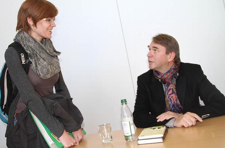 Spiegel gelesen hatte. "Sein Schreibstil hat mir gut gefallen, aber er war schon sehr speziell", gesteht der 16-Jährige. Auch Carolin Neu war sehr gespannt darauf, den Autor des Romans "Kriegsbraut" persönlich kennen zu lernen. Die 20-Jährige schreibt im Rahmen einer Seminararbeit über das Thema die "Darstellung des Afghanistan-Krieges in Gegenwartsromanen". Hätte nicht schon einer ihrer Mitschüler die Frage gestellt, aus welchen Quellen Kurbjuweit seine Informationen über Frauen an der Front bezieht, dann hätte sie sie auch gestellt. Kurbjuweit spricht von einer Mischung aus Einfühlungsvermögen und Recherchearbeit. Hinzu kam ein Besuch in Afghanistan. Die Schlüssigkeit der Handlung lässt er zum Schluss noch von seiner Frau überprüfen. Ein Roman entstehe über die Figur.