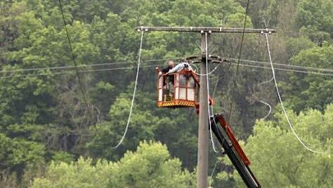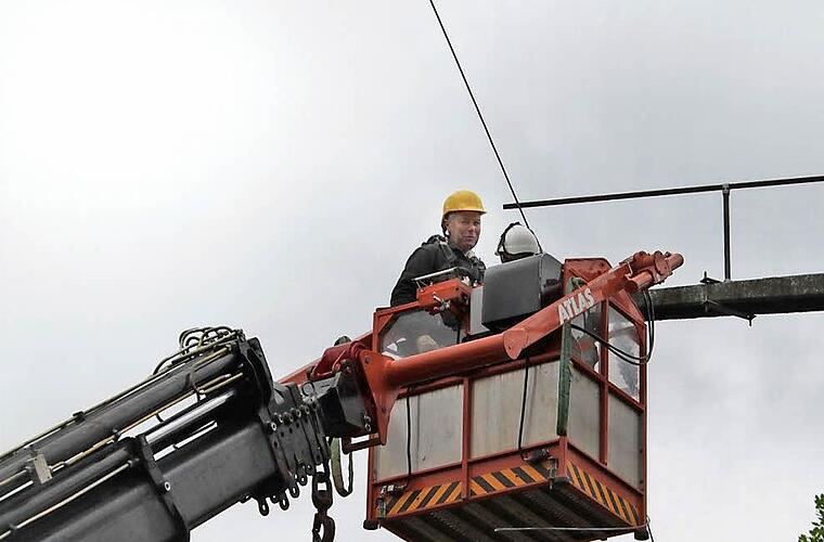 Reparaturen am Freitag Am Freitagvormittag waren die Reparaturarbeiten bereits in vollem Gange. Von 6 Uhr bis ungefähr 13 Uhr waren fünf Freileitungsmonteure aus Bamberg mit den Leitungen beschäftigt, berichten Zeugen vor Ort. Dabei waren die Bayernwerk-Mitarbeiter mit zwei Kränen mit Hebebühne im Einsatz. Einer stand auf dem Campingplatz am See und ein zweiter rund 220 Meter entfernt Richtung Unterbrunn auf der anderen Mainseite. Die Monteure zogen neue Leitungen ein und schlossen diese wieder ans Netz an. Während der Arbeiten sei Unterbrunn zeitweise mit einem Aggregat versorgt worden.