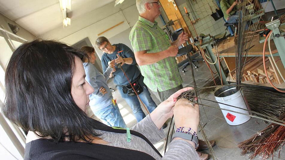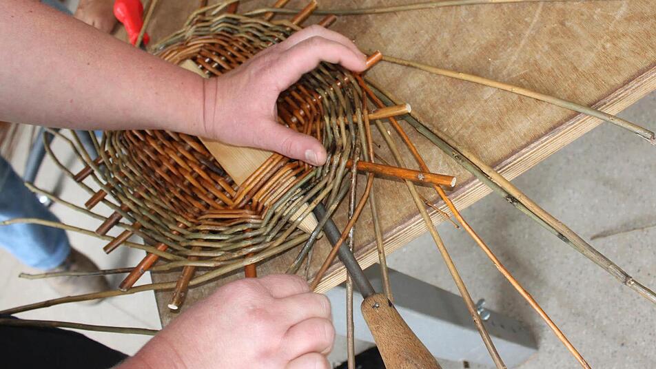 Mehr Anmeldungen hatte es allerdings für den Workshop mit Monika Engelhardt gegeben. Der Lehrsaal, in dem sie zeigt, wie man einen ovalen Korb macht, ist gut gefüllt. Die Flechterin aus dem mittelfränkischen Roth ist zum zweiten Mal bei der Sommerakademie dabei und damit zurück an der Schule, an der sie selbst von 1995 bis '98 ihre Ausbildung absolviert hatte. Außerdem ist sie auch Heilerziehungspflegerin und verbindet häufiger den pädagogischen mit dem handwerklichen Beruf.