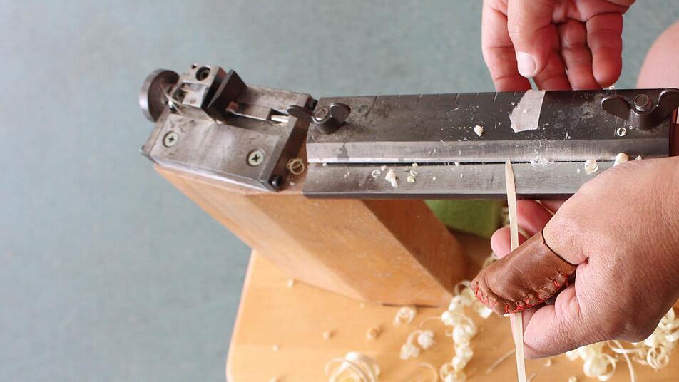 Ein paar Zimmer weiter brauchen die Sommerschüler an diesem ersten Tag besonders viel Geduld, denn der ist allein der Materialvorbereitung vorbehalten. Nina-Regina Nötzelmann, Flechtwerkgestalterin aus Michelau-Neuensee, erklärt den Umgang mit dem Weidenhobel. Es gilt, aus geschälten Weidenruten möglichst gleichmäßig dünne, zarte, schmale Streifen zu schneiden. Erst am zweiten Kurstag wird dann die gestalterische Komponente im Mittelpunkt stehen - mit dem Ziel, eine moderne Leuchte zu formen.