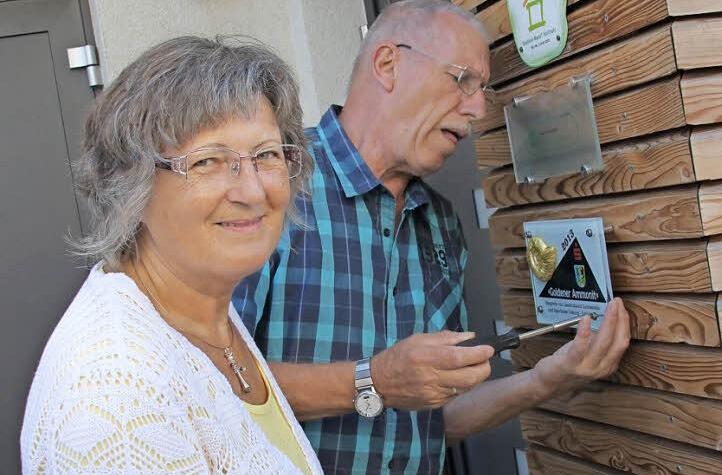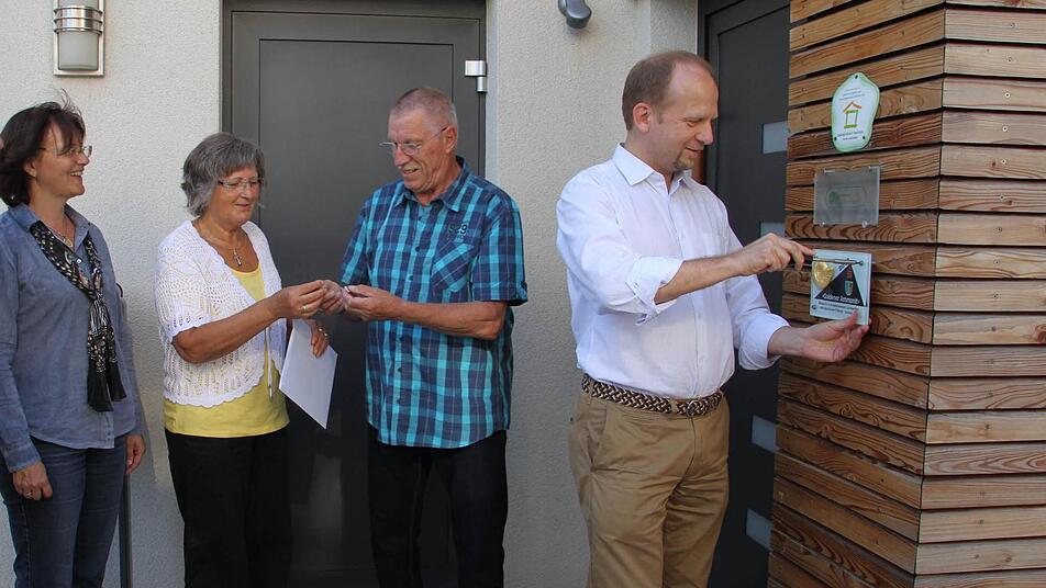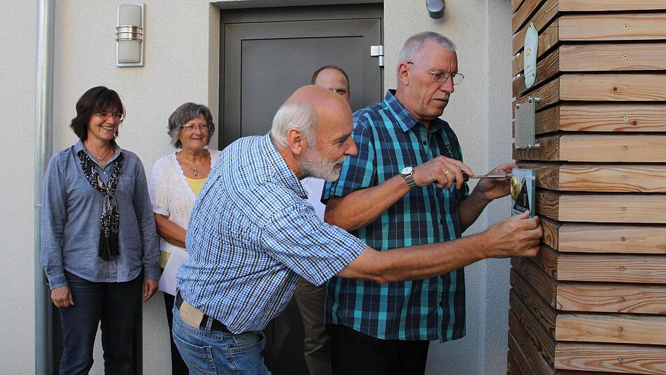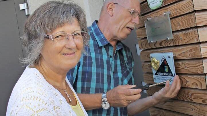 Alle drei Eigentumswohnungen in dem Haus sind inzwischen verkauft. Die neuen Nachbarn dürfen mit Hand anlegen, als das sichtbare Zeichen für den Baupreis "Goldener Ammonit" montiert wird. Die Baufirma Raab habe die heimische Baukultur gestärkt und zur Verbesserung der Lebensverhältnisse im Landkreis beigetragen, heißt es auf der zugehörigen Urkunde. Was die Lebensverhältnisse angeht, kann Rita Wittmann hierfür das beste Zeugnis ablegen.