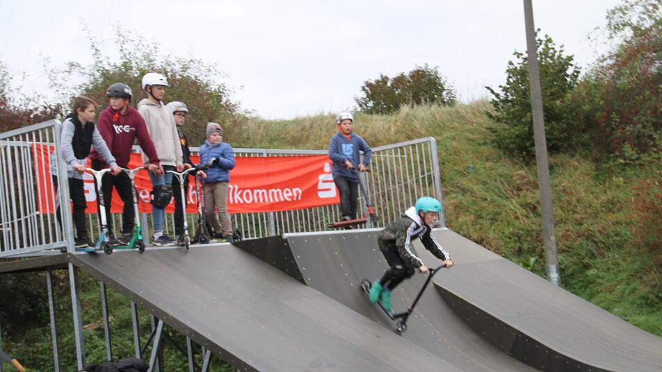 Nach der Eröffnung war Warmlaufen angesagt. Anschließend hatten die Jugendlichen beim anschließenden Scooter-Contest die Möglichkeit, ihr Können unter Beweis zu stellen. Das JUZ in Lichtenfels war Mitveranstalter. Bürgermeister Jürgen Kohmann dankt allen Sponsoren, die zur Realisierung der Anlage und des Wettbewerbs beigetragen haben.