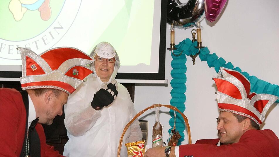 Nach aktuellem Vorbild gedenkt der SKK künftig eine wöchentliche Aktion "Freibier for Future" zu veranstalten, verkündete Graß. "Ein Prost auf den SKK" sprach "Hofnärrin" Margit Schnapp einen Toast aus. Die Tür zum Sitzungssaal ging auf - und hereinspaziert kam SKK-Närrin Karin mit einem großen Geschenkkorb. Dieser enthielt zwei Flaschen von der Brauerei "Schwarzer Bär", nicht mehr ganz frisches Obst und eine Glückwunschkarte zum 18. Geburtstag des heutigen Ehrenpräsidenten und SKK-Gründungsmitglieds Michael Lieb aus dem Jahr 1987. War doch keine so gute Idee, vom Geschenkkorb genascht zu haben ...