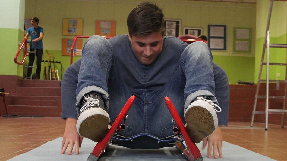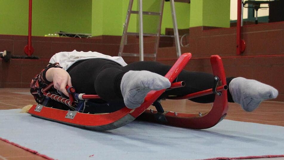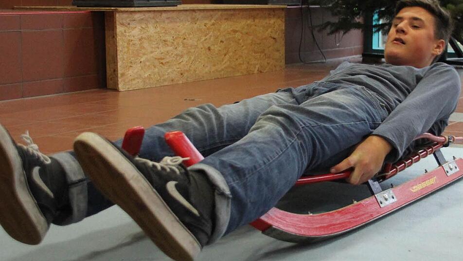 Lucas Dütsch paddelt drei Mal mit den Händen über den Boden. Blitzschnell beugt er seinen Oberkörper nach hinten und stellt die Fußspitzen - leicht nach innen gebeugt - steil. Sein Körper bildet mit dem Rodel, auf dem er jetzt liegt, eine Einheit. Sofort sieht Sportlehrer Wolfgang Klecker einige Details, die er an der Haltung des Neuntklässlers noch verbessern kann.