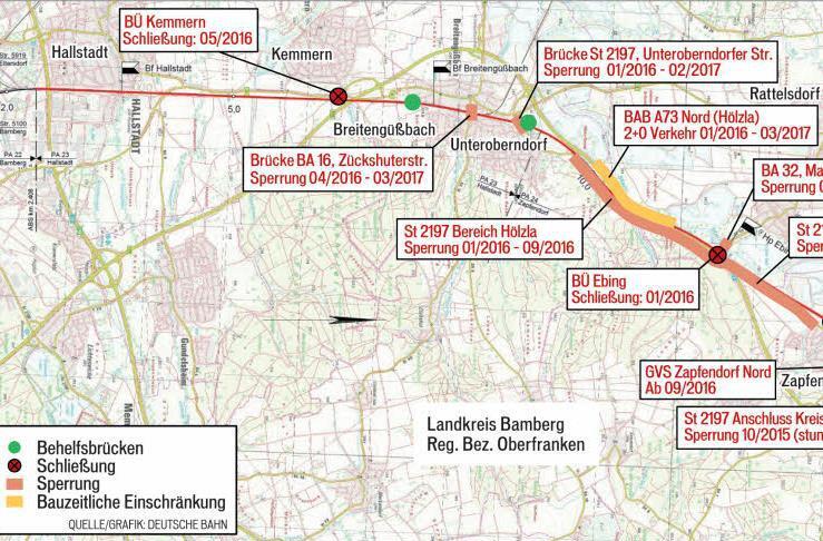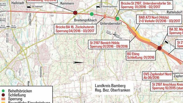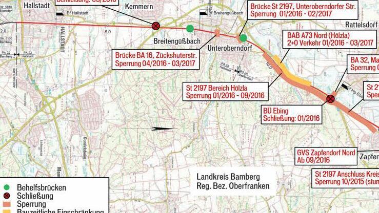 Gezeigt wurde in der Sitzung eine Übersichtskarte der Bahn zu angekündigten Sperrungen (siehe oben). Die sich über eineinhalb Jahre hinziehenden Einschnitte betreffen hauptsächlich den Landkreis Bamberg. Betont wurde, dass die A 73 während der angekündigten Bauarbeiten nicht gesperrt, sondern nur einspurig befahrbar sein werde.