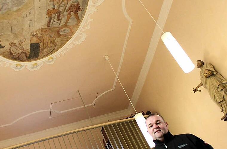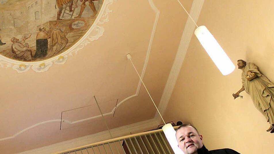 Als besonders würdig empfindet der 41-Jährige dabei, dass die jahrhundertealte Sandsteinplatte des Nebenaltars als neuer Volksaltar ihr Weihevolles behält. Es ist nach den Umbauarbeiten licht und hell geworden in der Kapelle, die an das Martyrium des Apostels Bartholomäus erinnert. Das Deckenfresko ist gewiss nicht von einem Tiepolo oder einem Michelangelo, es wirkt weit ungelenker und die Proportionen sind etwas schief. Körper und Gesichter zeigen unterschiedliche malerische Klasse. Ob womöglich zwei Maler am Werk waren? Möglich, räumt Morhard ein. Und lächelt.