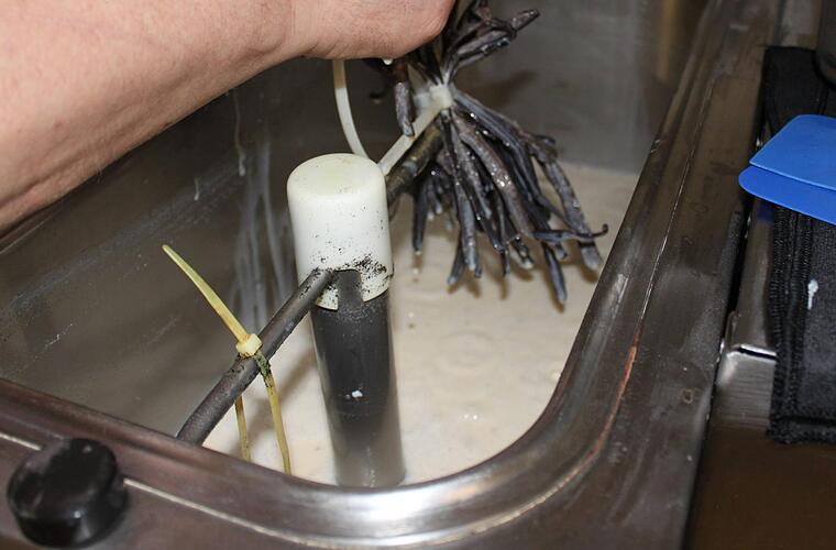In Supermärkten im Landkreis finden sich Vanillestangen wie immer in den Regalen. Sie kosten zwischen 2,99 und 3,99 Euro und sind alle bis 2021 haltbar. Doch selbst wenn man bei Edeka oder Rewe den Regalplatz leerräumen würde, hätte man noch nicht die Menge zusammen, die Eiskonditor Lanz für einen Herstellungsvorgang mit 70 bis 80 Litern braucht. Fast täglich arbeitet er ab früh um 7 Uhr bis gegen Mittag in der Eisküche, und gerade mit dem Vanilleeis ist ein hoher Aufwand verbunden. Jede Stange mit einem scharfen Messer anritzen und das Mark herauskratzen, anschließend werden das Mark sowie das ganze Bündel der Stangen in die kochende Grundmasse aus Milch, Eiern und Zucker gegeben, um das volle Aroma herauszulösen. Vanilleeis ist eine der meistgehenden Sorten in der Eisdiele, auch wenn bei der derzeitigen großen Hitze die Nachfrage nach Fruchteis erhöht ist.