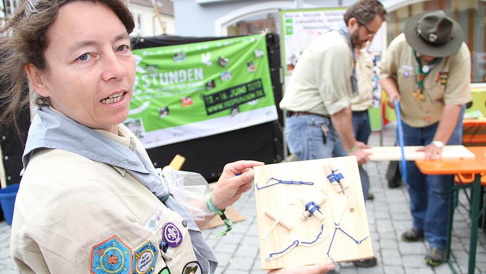 Ein richtiges Camp haben die Mitglieder der Deutschen Pfadfinderschaft Sankt Georg (DPSG) aufgebaut. Eine alte, umgewandelte Waschmaschinen-Trommel dient als Feuerstelle. Nicht weil es so kalt wäre, sondern zum Backen von Stockbrot. Bei den Pfadfindern haben interessierte Kinder und Jugendliche die Möglichkeit, Pfadfindertechniken kennenzulernen. "Wir zeigen interessierten Jugendlichen, welche Knoten bei den Pfadfindern gebraucht werden", erklärt Heike Leipold. Diese Knoten durften dann, auf ein Brett genagelt, als Andenken mit nach Hause genommen werden.