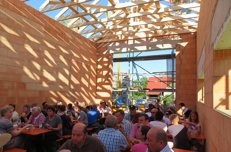 Beim neuen Gemeinschaftshaus wurde Richtfest gefeiert. Es wird viel Platz bieten für Bürger und Feuerwehr.