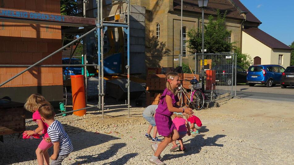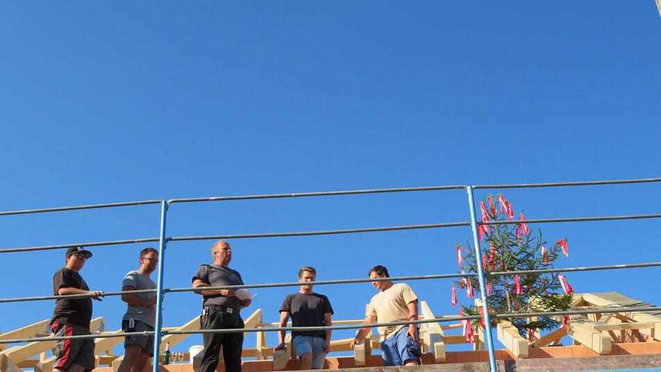 Sie waren tüchtig, die Zimmerer der Schwürbitzer Firma Thiel Holzbau: in nur zwei Tagen haben sie zu viert das Gebälk aufgerichtet. Am Donnerstagabend dann ragte ein bunt geschmückter Richtbaum auf dem Giebel des Rohbaus des Gemeinschaftshauses. Mitten im Ort, gegenüber der Kirche Maria Himmelfahrt und schräg gegenüber vom Gasthof wird hier richtig viel Platz geschaffen: für die Bürger.
