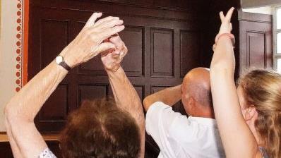 Grit Bittner, an diesem Sonntagnachmittag als "Reiseleiterin" fungierend, muss man einfach erlebt haben. Von Anfang an lud sie die Zuschauer ein, mit an Bord zu steigen. Im Handumdrehen konnte sie eine Großteil des Publikums dazu bewegen, einige Choreografien gemeinsam einzustudieren. Unter Einsatz des gesamten Oberkörpers wurde die Zuschauer so quasi Teil mancher Aufführungen - nicht Bühne hier und Zuschauer da, sondern Tanzcrew und Zuschauer gemeinsam, lautet die Devise des Ensembles. Und das klappte in Kutzenberg hervorragend, was Bittner zu der freilich augenzwinkernd zu verstehenden humorvollen Feststellung veranlasste: "Super! Andere brauchen für das Erlernen dieser Choreografie in der Regel Wochen - aber Ihr - einfach fantastisch!"