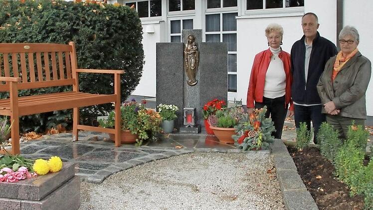 Neue Gestaltung Seit der Einweihung ist an dieser Stelle im Friedhof viel passiert. Die Einrahmung der Wiese, die Bank sowie die Gestaltung beider Steine wurden vom Gartenbauverein selbst verwirklicht. Die Mitglieder Peter Stündel und Georg Walter haben die Gedenksteine aus alten Steinresten selbst gestaltet. Vorsitzende Marlies Thiele ist sehr stolz, was in der letzten Zeit hier passiert ist, besonders auf den Gedenkstein mit der Madonna. Rund herum wurde alles gefließt und eine Bank aufgestellt. "Hier können die Angehörigen Blumen und Kerzen hinstellen. Momentan ist es nicht all zu viel, aber zu Allerheiligen wird das hoffentlich wieder mehr", so Thiele. Die vier Mitglieder des Gartenbauvereins, Marlies Thiele, Katharina Lutz, Peter Stündel und Georg Walter sind im Herbst fast täglich am anonymen Gräberfeld und befreien die Fläche vom herabfallenden Laub.