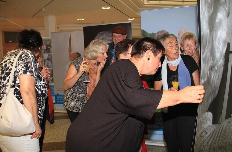 Gezeigt werden Bilder, die zum Nachdenken, aber auch zum Schmunzeln anregen. Wie beispielsweise das Bild, das eine weißhaarige Seniorin mit Rollator neben einen gelben Sportwagen mit offenem Verdeck zeigt. Auf einem anderen Bild ist ein Mann zu sehen, der im Freien mit seinem Enkel spielt und ihn dabei in die Luft hebt. Vor Lebensfreude sprüht auch die Aufnahme einer Frau, die auf einem gelben Motorrad sitzt.