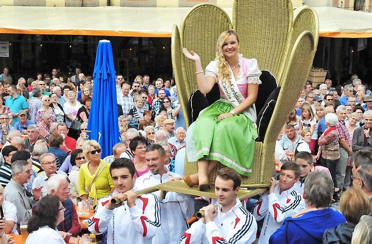 Gegen 12.45 Uhr endete die Amtszeit von Helena I. Der Thorn war sozusagen verwaist. Aber nicht lange. Vom Rathaus her zog Carolin I., winkend und getragen von vier starken jungen Männern auf dem Flechtthron zur Bühne.