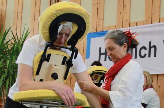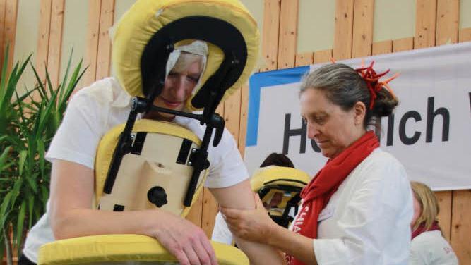 Die Shiatsu-Regionalgruppe Oberfranken zeigte auf der Bühne die japanische Fingerdruckmassage. Dabei wird der Mensch ganzheitlich betrachtet. Die Anwendung löst Blockaden und harmonisiert Körper, Geist und Seele. Christel Scholz, ehrenamtliche BRK-Sanitäterin, empfand die Massage als sehr entspannend. Es sei ein sehr angenehmes, befreiendes Gefühl. Als sei jeder Druck von ihr genommen, sagte die Sanitäterin.