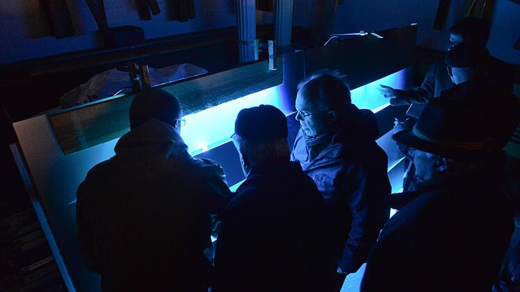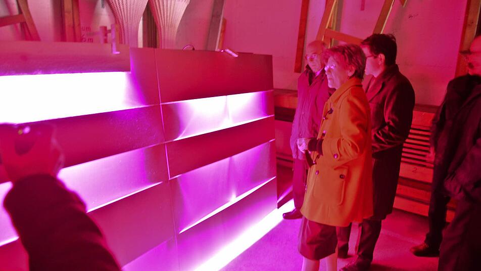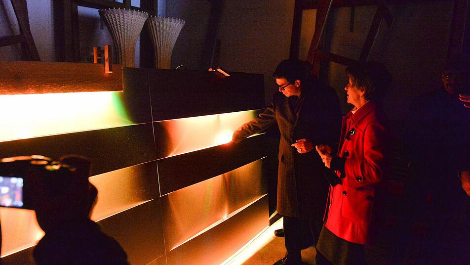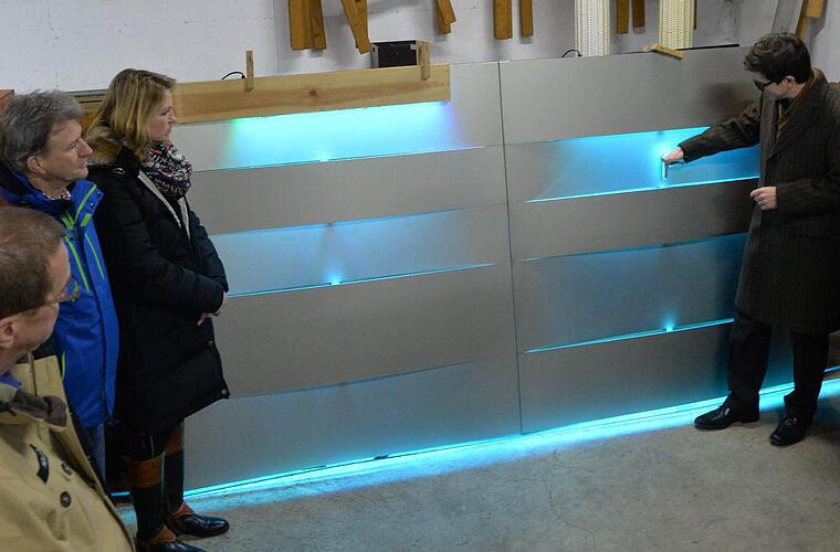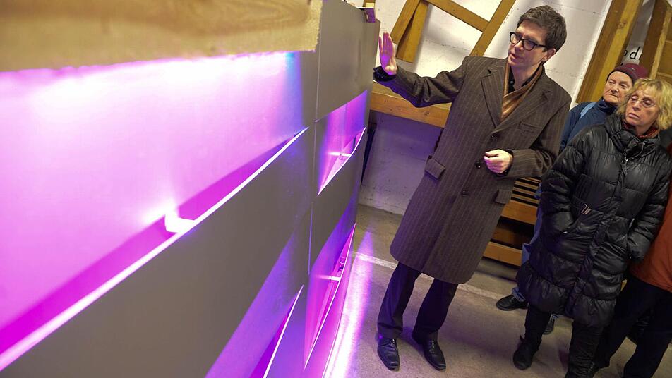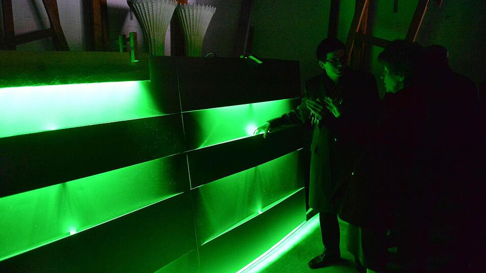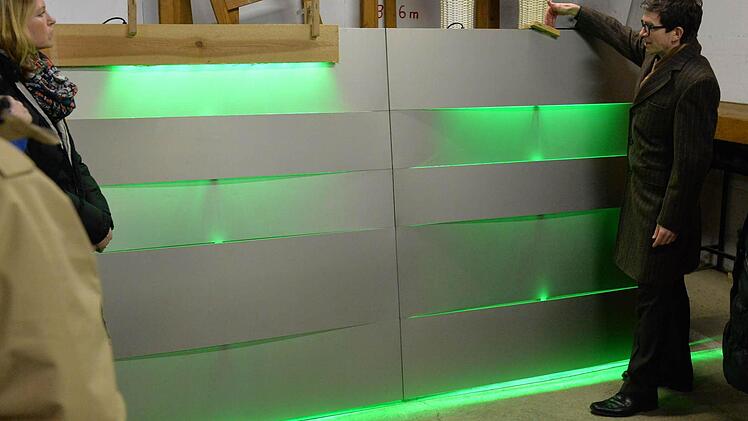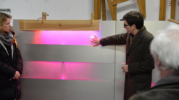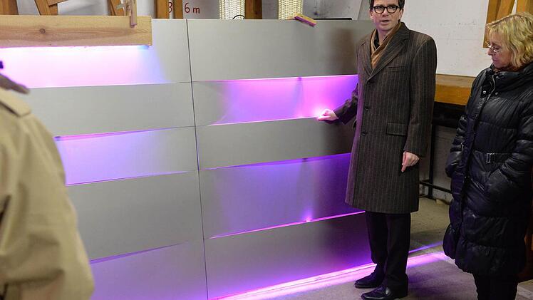 Lichtspiele im Inneren einer dunklen Halle des Lichtenfelser Bauhofes in der Jahnstraße. Grün, Blau, Pink, Gelb und Rot im Wechsel. Im LED-Farbspektrum erleuchtet das drei Meter Breite und 1,60 Meter hohe Modell aus Alu-Blechen. Dass es robust ist, demonstriert Architekt Gunter Ulrichs-Fischer hörbar. Wumm. "Sie können heute schon gut dagegen treten", sagt er. Und dass man die Farben der Beleuchtung natürlich festlegen könne.